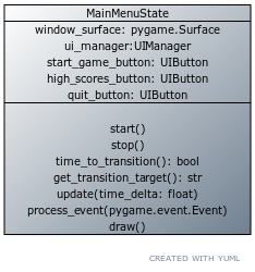 - The introductory menu, where we can see the title of the game, start a new game and look at the high scores - MainMenuState